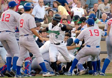 The Hawks broke open a 1-0 game in the fourth with a bases-loaded walk by Hak-Ju Lee and a two-run infield single from Logan Watkins. However, after a Lee bunt-base hit in the eighth that resulted in a throwing error and two runs to score to push the Boise lead to 7-0, Frogs reliever Kyle Brown buzzed Watkins with a pair of pitches – with plate umpire Javier Cantu ejecting the lefty. Following an exchange with Cantu, Everett skipper John Tamargo got into a war of words with Hawks manager Casey Kopitzke near the third-base bag – with the benches and bullpens quickly emptying. Although there was some short-range shouting, nothing more than a war of words were exchanged.