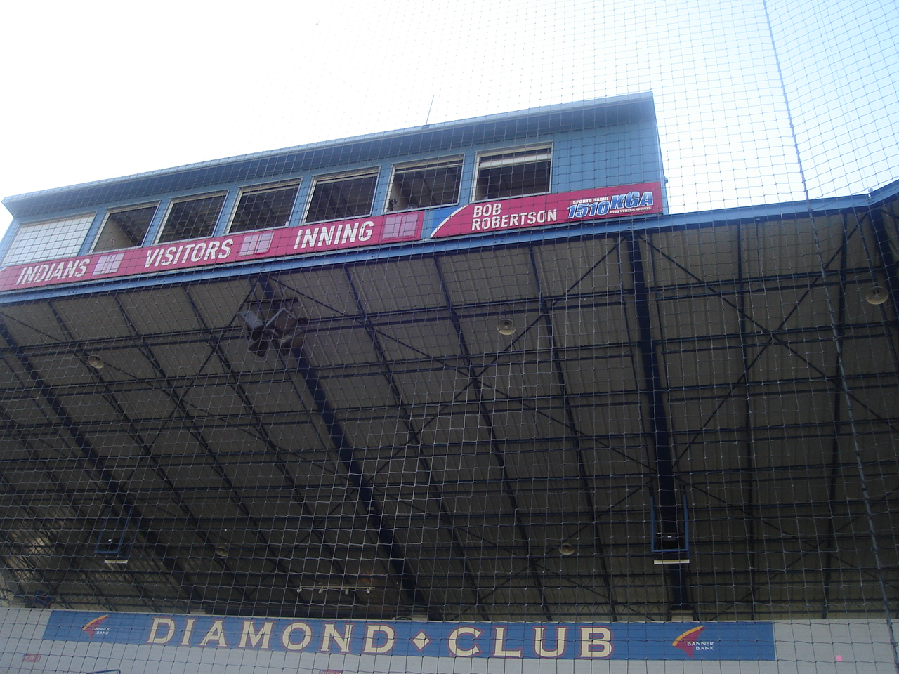 THE LONG WALK TO THE BOOTH: The opening day at Avista is always a long haul for any visiting broadcaster, as you must degociate three different flights of stairs to get to the booth, situated high atop the ballpark (pictured right). (To see the last set of stairs and your first video look at the park, click here). The vantage point is the best in the league – and the crowd tonight was outstanding (4,915), the second largest crowd the Hawks have played in front of during the 2009 season.