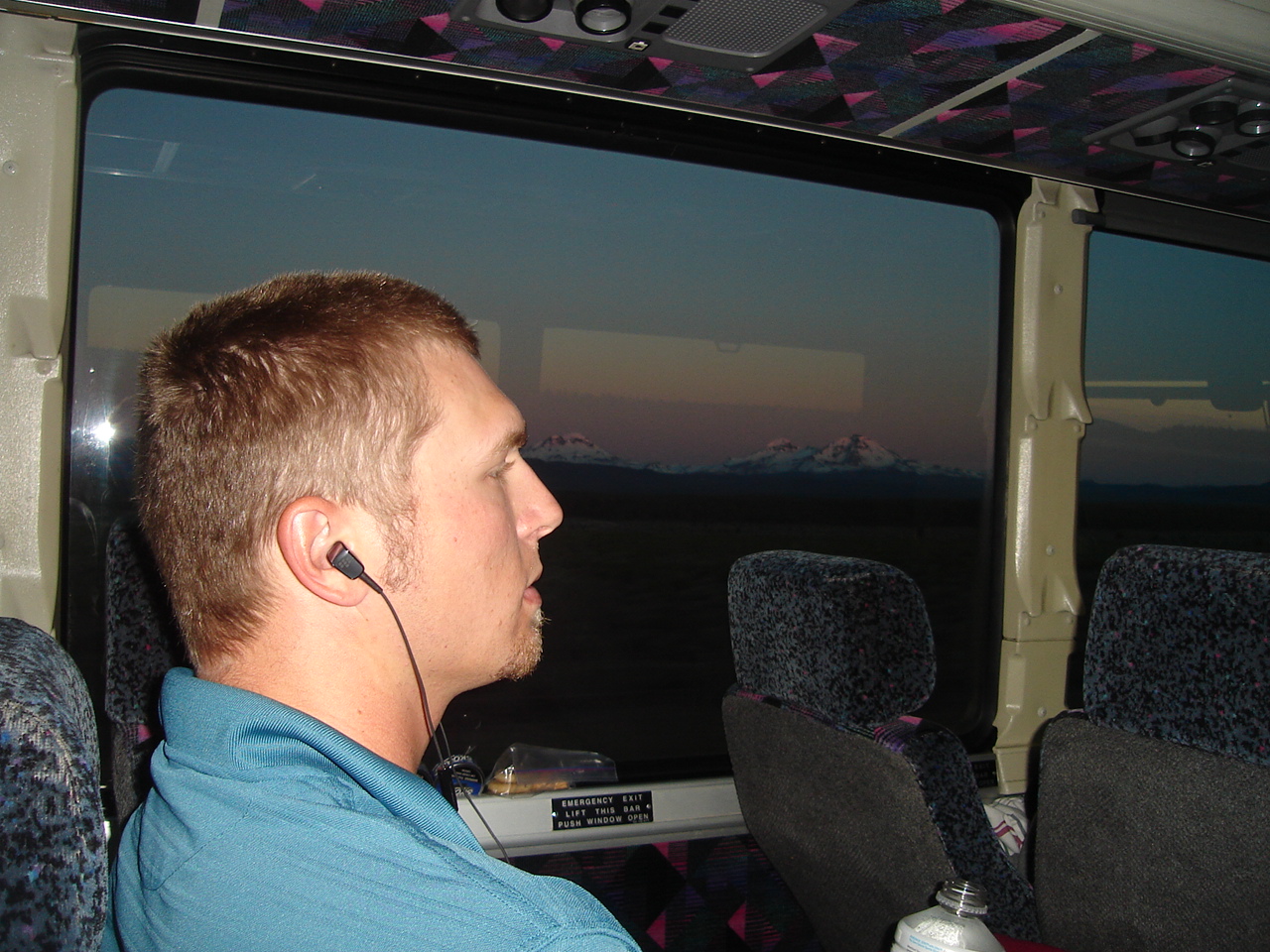 Many will remember that during the game on Friday, a couple of rainbows showed up in Boise – as did a few light rain showers. Well, in Eastern Oregon, it rained heavily all day and into the night – raising the level of the Malheur River and its tributaries. Around 1 a.m. in the morning, the bus was stopped in its tracks in the middle of nowhere (between Vale and Juntura) by road flares and a flagger. What ensued was a harrowing two mile trip down Highway 20 behind a pilot car acrossed a flooded road – where you could not see the pavement (Hal, our trusty driver, said it was like driving on ice). It wasn’t fun. (Watch video from early in the morning on the way to Eugene – notice the snow-capped mountains in the distance)