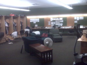 NO CHANGES AT PK: In their second year at the University of Oregon’s PK Park, not much has changed from my vantage point at the newest ball park in the Northwest League. Though the press box is amazing – with a phenomenal view, it is still a struggle with its configuration, to get scoring decisions and substitutions on a timely manner (which are not indicated on the scoreboard or video board). The clubhouse situation is still a mess, as the Hawks must hike at least a 1/4 mile from the Autzen Stadium visiting football locker room, around the stadium on the sidewalk of a busy street, then in the gate of the stadium (I don’t like the idea of the players having to fight through fans/etc. going to-and-from the clubhouse). A new clubhouse was said last year to be in the works in right field – but no construction is visible. The Ems, however, are able to use the spacious U of O clubhouse at the stadium (with the Coaches’ Office pictured).