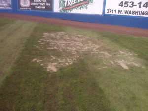 A leak in the sprinkler system in right field has caused the area near the warning track to turn marshy – literally. If it were a golf course, there would be a painted line around it and “clean and lift” rules would be in place. The groundscrew has been forced to turn off the water to minimize the leak – which in turn, has caused enormous brown patches in the outfield, which is a thin layer of grass at best.