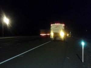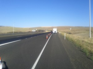 UPDATE ON THE SITUATION – A second bus, which was brought in all the way from Boise (which surprised many of us since there are charter companies in both Pendleton and the Tri-Cities), arrived in at the scene just before 8 a.m. Pacific Time – five hours and fifty minutes from the time we pulled off the road. We were visited about 30 minutes prior by an Oregon Department of Transportation worker, who loaned us some cones to set up a safe work area (which I set up – using my years of experience as a worker in the Pierce County Traffic Operations Division from 1994-2001, in fact, was happy that my taper of cones was perfectly straight). The bus was unpacked and repacked in about 20 minutes – with pitching coach David Rosario and I doing a lot of the packing (loading a bus is like loading the back of a car for a vacation), and we were headed on the road after six hours and nine minutes.