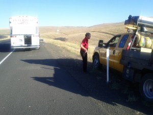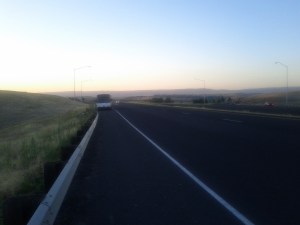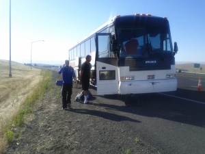 There is always something new for this blog, and maybe since we’ve hit the 20,000 page view mark, we’d need to try something – writing from the side of the road on the bus. Literally, I am sitting on a guardrail next to Interstate 84 in Eastern Oregon (mile marker 207 is about 100 yards in front of me), as our team bus broke down around 2 a.m. this morning (pictured left). When Hal our bus driver, Bob Grimes, and I checked out the damage in the back (bus engines are in the back of the bus), we could smell coolant and see tons of liquid sprayed atop the outside of the bus. Four hours later, we are still sitting here, waiting for another bus to make its way to Pendleton (and just got word that the replacement bus is still 100 miles away and has a possible air leak).
