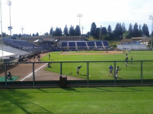 With the Hawks having won 2-of-3 games in Everett and sitting atop the East Division with a 10-5 record, it’s time to take a quick look at things here in Everett – located about 30 minutes north of downtown Seattle. The first look is that of the ballparks – as there are two Everett Memorial Stadiums (one for baseball and one for football, adjacent to each other) – with the video taken from the locker rooms that serve as the baseball clubhouse.