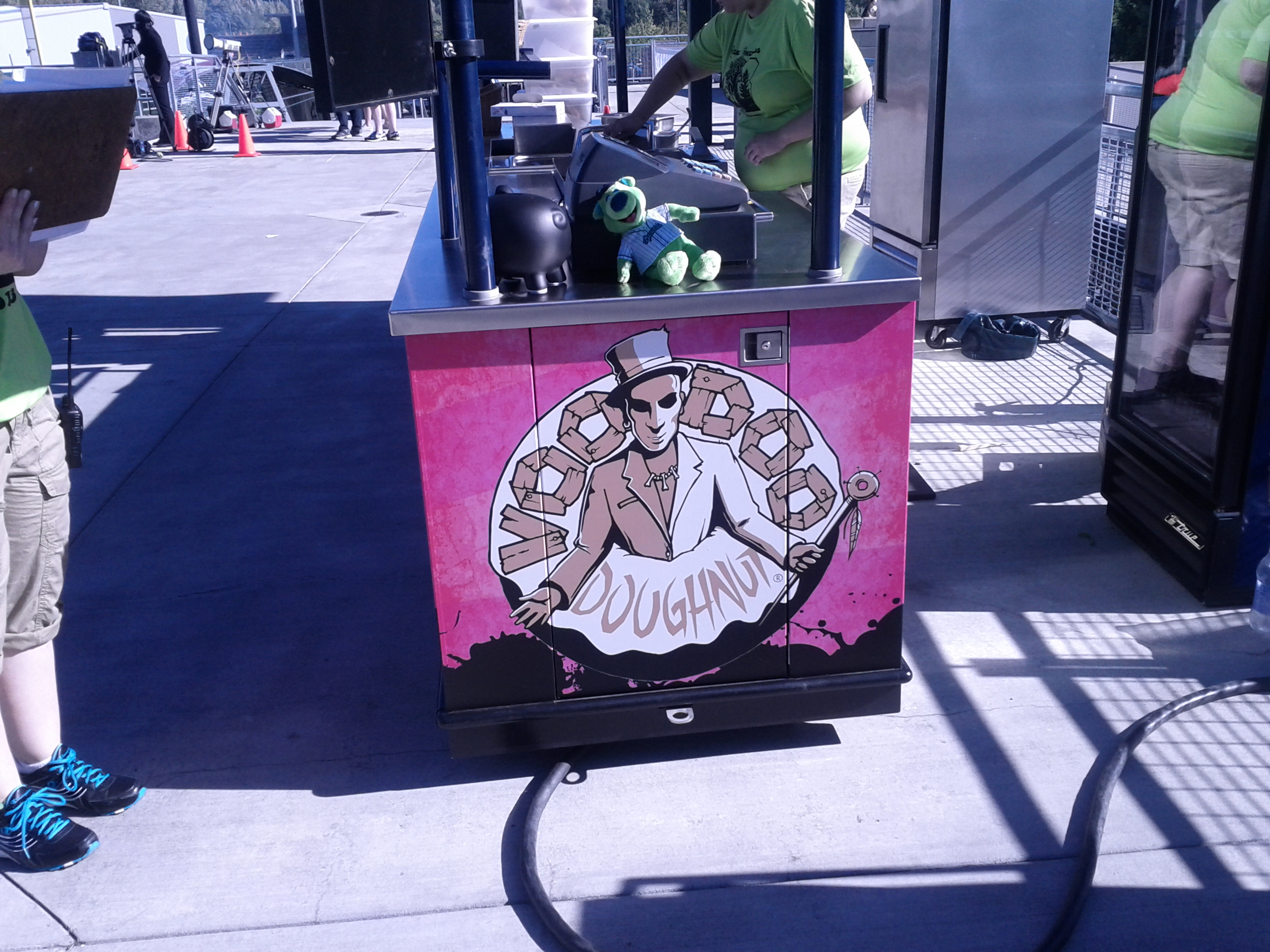 CONCESSIONS – Game 1 of the season featured hamburgers in the press box, but I had the opportunity to tour the park to see what they had to offer. Since there are no permanent facilities for concessions, the Ems have a bunch of food trucks/trailers throughout the stadium – including a barbecue booth, a fish and chips trailer, and a Voodoo Donut booth that serves a Maple Bacon Voodoo Donut Bratwurst.
