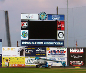 The game also marked the debut of Everett’s newest toy from the State of Washington – what they are deeming AquaVision. The Frogs used the state allocated funds to erect the largest video board in the Northwest League and the largest video board of the five minor league teams in the state (Tacoma, Spokane, Tri-City, Yakima, Everett). Broadcaster Pat Dillon told me that they will have rudimentary video and graphics to start – as some of the good games (shell game, boat race, etc.) cost upwards of 5-to-10 grand to purchase).