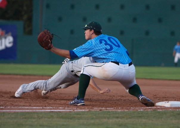 It was a one-man wrecking crew tonight for the Salem-Keizer Volcanoes in the form of San Francisco Giants third-round pick Chris Dominguez (pictured left) out of Louisville. The 6-5, 240 pound third baseman clubbed his fourth home run of the season in the fourth inning – a mammoth shot to left field, to get S-K on the board, then walked, stole second, and scored on a Luke Anders single in the sixth to tie the game. He then walked, stole second, and scored on Drew Biery’s RBI single in the eight for the game winning run. Dominguez looks like a big league player – and once he is able to command the strike zone, and probably end up moving to first base in the end, will definitely be a force in the Bay Area in coming years…